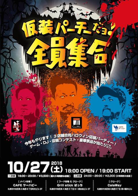 「仮装ぱーちーだヨ!全員集合」は、毎年ハロウインの時期に、キャラウェイ、Grill stick ばっち、CAFE サーハビーの3店舗が企画して、40を超える札幌の飲食店や企業の協力・協賛によって開催される、いい大人がおもいっきりハメを外して楽しめるパーティーです!